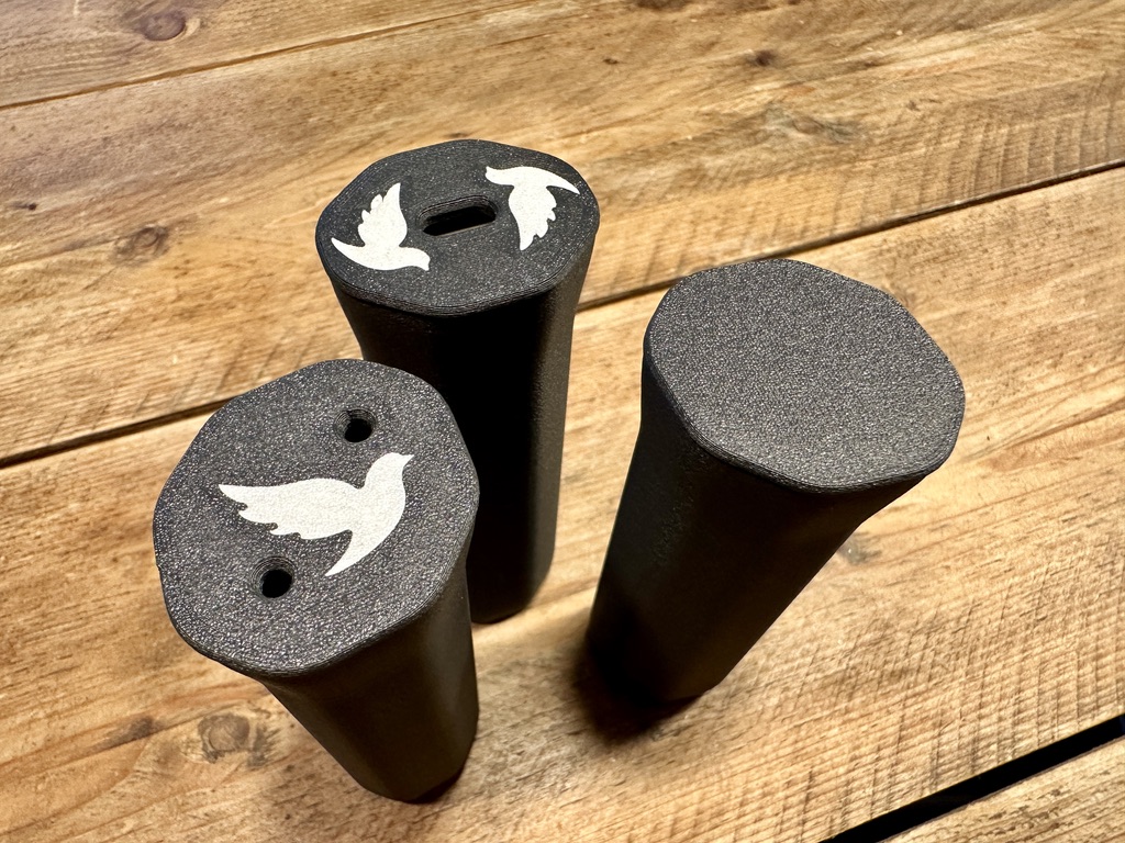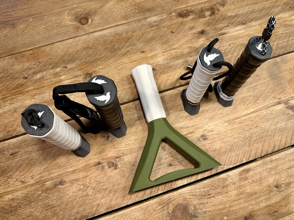 - developing a set of handles and bottom plugs, with variety of grip thickness, embedded custom logos and several wrist strap attachment options,